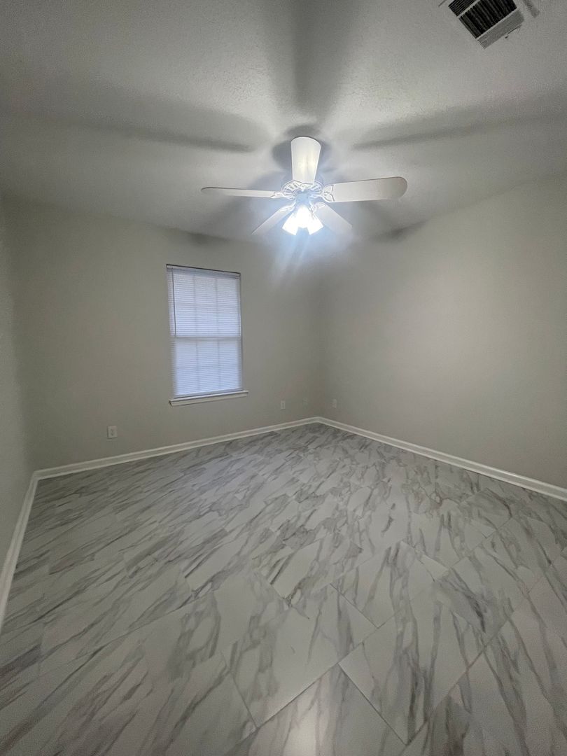 Spacious living room with tray ceiling, bright kitchen with plenty of storage space with newly painted cabinets and new porcelain tile countertops and backsplash in kitchen, dedicated dining room with pantry, new porcelain tile countertop in bathrooms, all brand new tile flooring throughout, bright new paint and new fixtures, new refrigerator, new dishwasher, new flat top range, large laundry room with closet fits full sized washer and dryer, blinds on all windows, large gated backyard with privacy fence. Front yard landscaping included and trash pick-up is included. Tenant responsible for backyard landscaping.